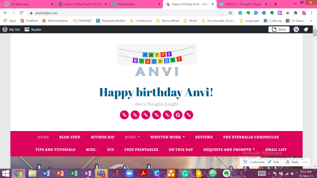 I cannot believe it’s been a year already! Anvi’s Thoughts Caught is one year old! (On a side, less interesting note – I turn 15 tomorrow) To celebrate, I will be posting a WHOLE lot more in March, because I have like 20 posts in my drafts, but, you know, FINAL EXAMS don’t care about posting schedules. See you all after 14th March, in the ides of March! I can’t wait 😉