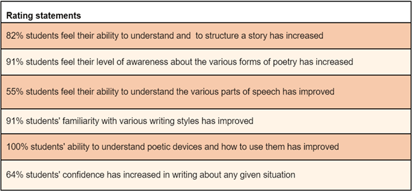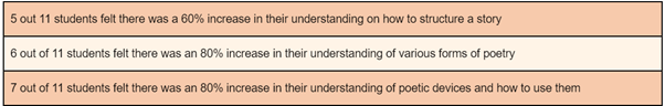 - 60% of students felt more confident in their creative abilities, an increase of 200%.
